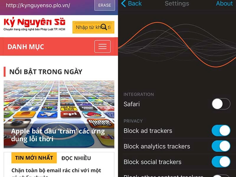 Ứng dụng được thiết lập mặc định để ngăn chặn các cookies theo dõi, hỗ trợ xóa lịch sử lướt web chỉ với một cú chạm. Việc chặn các thành phần không cần thiết sẽ giúp tăng tốc độ và hiệu suất khi lướt web. Bên cạnh đó, bạn có thể truy cập vào phần cài đặt ứng dụng và mang tính năng chặn quảng cáo, theo dõi từ Firefox Focus lên Safari.