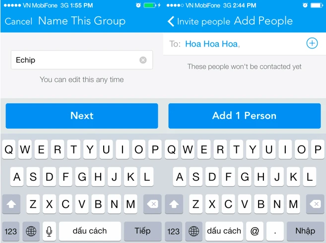 Tiếp theo, bạn hãy nhấn Create new group,đặt tên cho nhóm rồi nhấn Next. Kế đến, bạn hãy mời những người muốn chia sẻ bằng cách chạm vào biểu tượng dấu cộng, nhập địa chỉ email, số điện thoại hoặc tên có trong danh bạ rồi nhấn Add person.