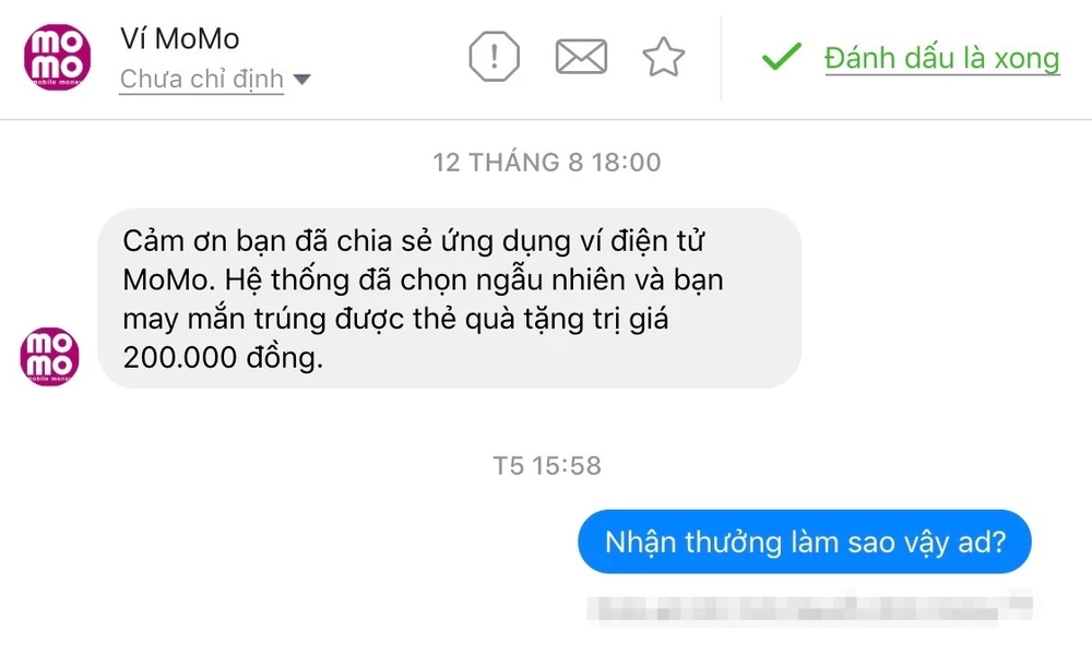 Sau đó, kẻ gian sẽ gọi điện thoại hoặc nhắn tin cho bạn qua Messenger với nội dung trúng thưởng voucher 200.000 đồng trong Ví MoMo. Lưu ý, fanpage trên Facebook không có tính năng gọi điện thoại và kết bạn, thêm vào đó, nếu MoMo “chính chủ” tặng quà, tiền sẽ được chuyển thẳng vào tài khoản của người dùng chứ không nhắn tin hoặc gọi điện thoại riêng.