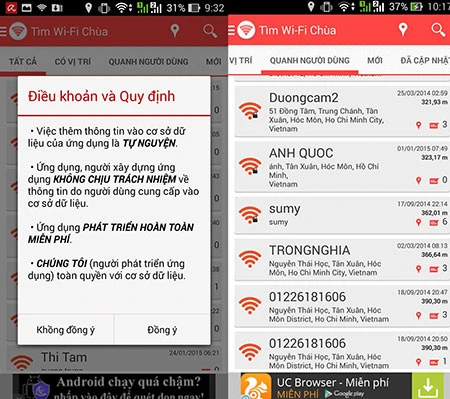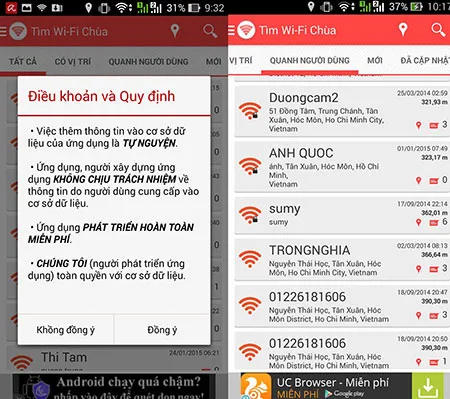 Điển hình là hai ứng dụng được đánh giá là có tính chia sẻ và tương tác khá cao trên CH Play đó là: “Wi-Fi chùa” và “Find.Free.Wi-Fi”. Cả hai ứng dụng trên đều có chức năng gửi mật khẩu mới từ nơi mình truy cập để giúp người khác có thể truy cập một cách dễ dùng nhất. Khi chúng tôi thực hiện kiểm tra ứng dụng, chúng tôi đã kết nối thành công 90% các điểm mạng được chia sẻ gần đó, mặc dù một số khác đã được đổi mật khẩu và chưa được cập nhật mới.