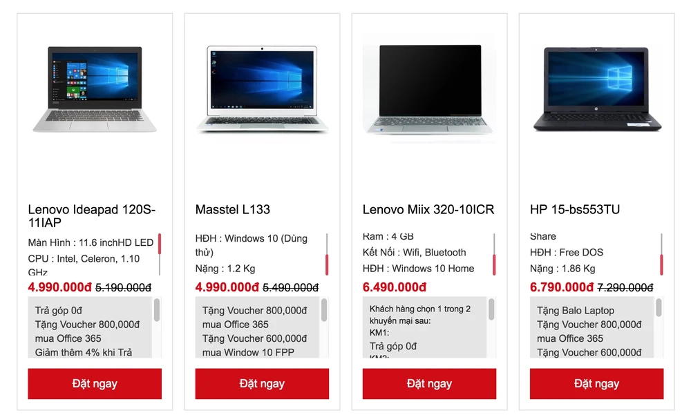 Mới đây, FPT Shop đã triển khai chương trình bán laptop giá sốc chỉ từ 4,99 triệu đồng với cam kết "Ở đâu rẻ hơn, hoàn lại tiền", đồng thời hỗ trợ trả góp 0% (tùy model), tặng balo cùng voucher có giá trị lên đến 1.400.000 đồng để mua Office 365 và Win 10 bản quyền.