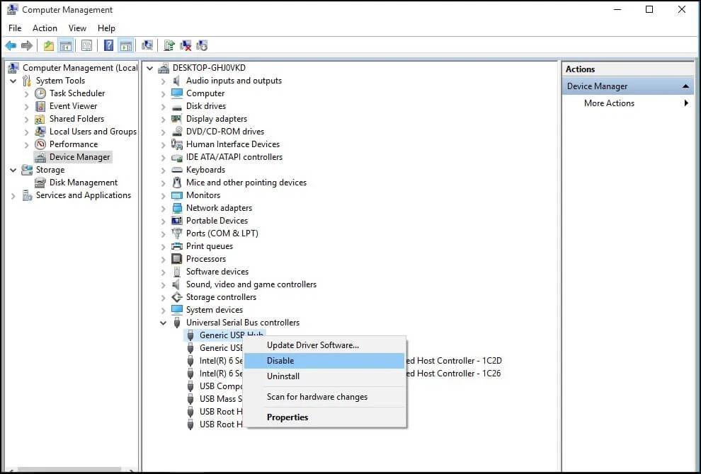 - Bước 3: Nhấn phải chuột vào các cổng USB trong danh sách và chọn Disable, sau đó khởi động lại máy tính.