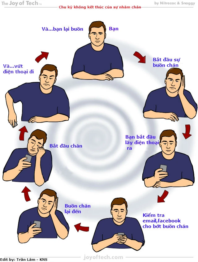 Mọi thứ bắt đầu nếu như bạn đang chờ đợi ai đó, bạn không làm việc gì cả, trong coi nhà cửa một mình…điều này sẽ gây ra cho bạn sự buồn chán. Kết quả là nếu bạn có trong tay một chiếc smartphone, bạn vẫn buồn chán. Bởi chu kỳ của sự buồn chán được thể hiện trong bức ảnh dưới đây. Bạn có thể cảm thấy đúng khi xem bức ảnh: “Chu kỳ không kết thúc của sự buồn chán”.