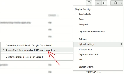 2. Click nút “cog” phía bên phải. Dưới phần “Upload Settings”, chọn “Convert text from uploaded PDF and image files.”