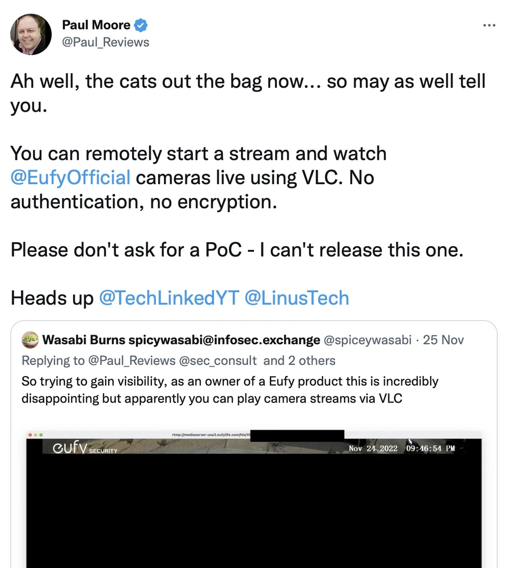 Tuy nhiên, nhà nghiên cứu bảo mật Paul Moore đã chứng minh điều này không đúng bởi dữ liệu vẫn được tải lên đám mây (thậm chí ngay cả khi bộ nhớ đám mây bị vô hiệu hóa). Cụ thể, anh đã tìm ra lỗ hổng cho phép xem hoặc phát trực tiếp các cảnh quay của camera thông qua phần mềm đa phương tiện VLC, theo The Verge.