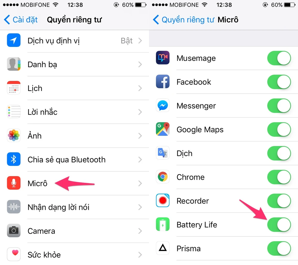 - iOS: Đối với các thiết bị iOS (iPhone, iPad và iPod Touch), người dùng chỉ cần truy cập vào Settings (cài đặt) > Privacy (riêng tư) > Microphone và kiểm tra lại danh sách các ứng dụng đã cấp quyền truy cập.