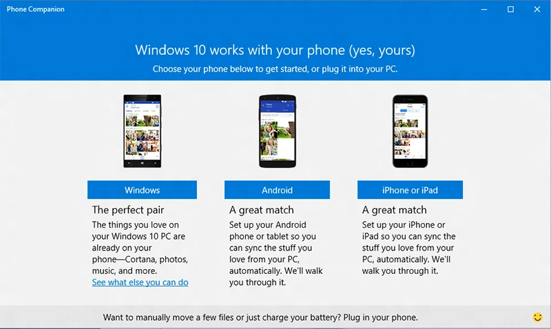 Nhằm giúp quá trình sử dụng Cortana được dễ dàng hơn, Microsoft còn giới thiệu một ứng dụng có tên Phone Companion dành cho PC. Tính năng của ứng dụng này giúp người dùng kết nối, đồng bộ dữ liệu của mình với điện thoại một cách dễ dàng hơn, bao gồm việc hướng dẫn cài đặt OneDrive, cách chép nhạc, cách tải OneNote, Skype, Office, Outlook, và tất nhiên là có cả Cortana.
