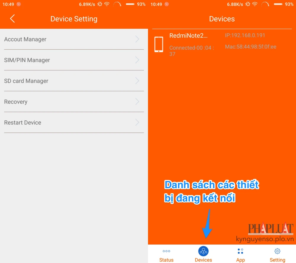 - Bước 2: Giao diện của Tenda Link khá đơn giản với 4 mục chính gồm Status (trạng thái kết nối), Devices (danh sách các thiết bị đang kết nối), App (quản lý dữ liệu chia sẻ) và cuối cùng là Setting (cấu hình thiết bị).