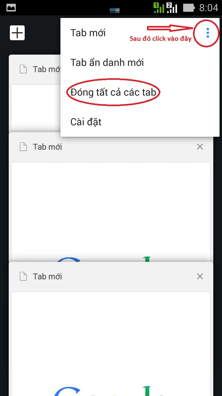 Riêng đối với phiên bản trên smartphone thì làm sao để đóng các tab lại? Hiện tại giao diện trên các dòng điện thoại Android nếu bạn muốn đóng tab thì phải click vào khu vực thay đổi tab, sau đó bạn click vào nút menu gần đấy, và lựa chọn đóng các tab lại. Xem ảnh để rõ hơn.