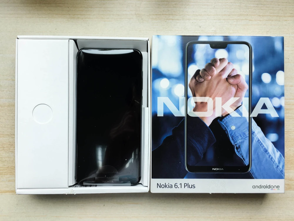 Hộp sản phẩm tương đối đơn giản với tông màu xanh dương chủ đạo, bên trong sẽ có một chiếc điện thoại Nokia 6.1 Plus và các phụ kiện đi kèm (dây cáp, củ sạc, tai nghe, cây chọt SIM và sách hướng dẫn sử dụng).