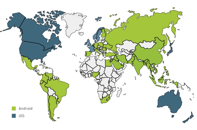 Bản đồ phân chia thị phần giữa Android và iOS trên toàn cầu. Ảnh: Internet