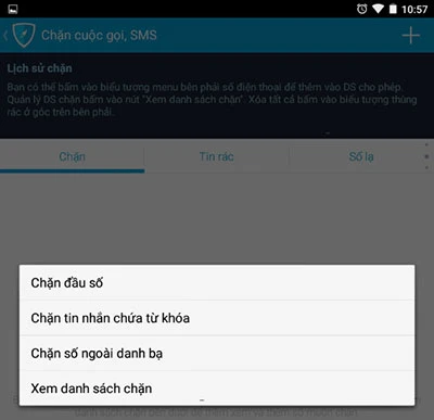Để đơn giản khi sử dụng, bạn có thể chọn mục Settings và chọn tiếng Việt. Giao diện chính của ứng dụng khá đơn giản, các tính năng chính đều được đưa ra “mặt tiền”. Để chặn cuộc gọi và các tin nhắn rác, bạn chạm vào biểu tượng chiếc smartphone. Tại mục Chặn, bạn có thể sử dụng các tùy chọn mà chương trình cung cấp như Chặn đầu số (090, 098, 0188…), Chặn tin nhắn chứa từ khóa (nhập vào từ khóa bất kỳ bạn mong muốn), Chặn số ngoài danh bạ (mọi số lạ nằm ngoài danh bạ sẽ không gọi được cho bạn, rất hữu ích để chặn các cuộc gọi điện thoại mời mua bảo hiểm, ngân hàng) và Xem danh sách chặn.