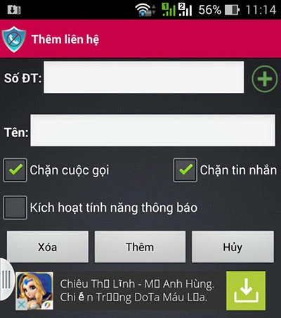 Mục Danh sách chặn là nơi để bạn thêm vào các số điện thoại cần chặn từ danh bạ, từ nhật ký cuộc gọi hoặc một số bất kỳ bên ngoài. Khi đã hoàn tất, bạn đánh dấu chọn vào các tính năng mong muốn như Chặn cuộc gọi hoặc Chặn tin nhắn rồi nhấn Thêm để lưu lại. Ngoài ra, chương trình cũng hỗ trợ người dùng chặn tin nhắn có chứa từ khóa hay các nội dung quảng cáo dễ dàng.