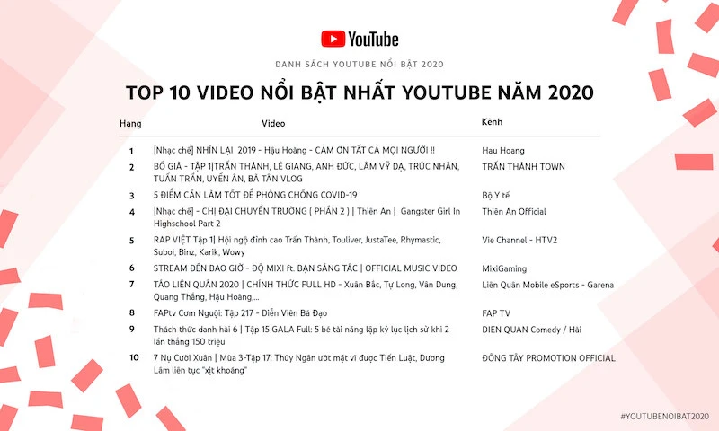 Đáng chú ý nhất trong danh sách Top 10 Video nổi bật nhất YouTube năm 2020 là sự góp mặt của video hướng dẫn các nguyên tắc phòng chống dịch bệnh từ kênh YouTube chính thức của Bộ Y Tế Việt Nam. Video được đăng tải vào tháng 4 năm 2020, thời điểm dịch bệnh COVID-19 bùng phát tại Việt Nam.