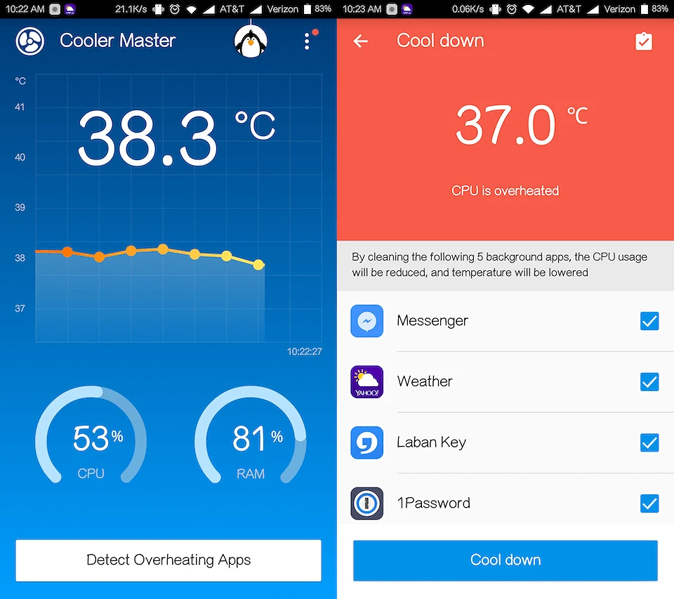Nếu cảm thấy điện thoại quá nóng, bạn chỉ cần chạm vào nút Detect Overheating Apps, sau đó đánh dấu chọn vào các ứng dụng đang chạy nền và nhấn Clean Up. Ngoài ra, CM còn có chức năng tự động hiển thị cảnh báo trên màn hình nếu nhiệt độ tăng cao bất thường, giúp người dùng ngăn chặn kịp thời các vấn đề liên quan đến việc hư hỏng phần cứng hoặc cháy nổ.