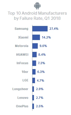 Đối với các dòng điện thoại Android, Samsung có tỉ lệ hư hỏng cao nhất với 27,4%, Xiaomi đứng thứ hai với 14,2%, Motorola đứng ở thứ ba với 9,6%. Những vị trí sau đó thuộc về Lenovo, OnePlus, Huawei, InFocus… đa số đều là các nhà sản xuất của Trung Quốc.