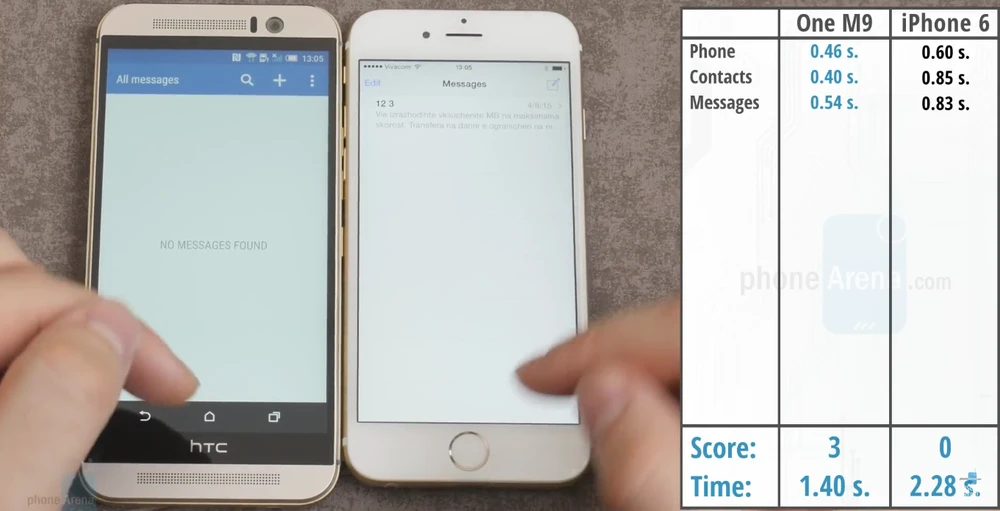 Không ngạc nhiên, chiếc M9 tỏ ra khá vượt trội trong những tác vụ ban đầu. Những ứng dụng mặc định của chiếc M9 (native app) tỏ ra nhanh hơn nhiều nếu so với đối thủ của nó, chiếc iPhone 6. Mặc dù sự chênh lệch là rất nhỏ, nhưng các bạn vẫn sẽ dễ dàng nhận ra sự khác biệt này. Có vẻ HTC đã làm rất tốt trong việc tối ưu các hiệu ứng chuyển tiếp, nên thời gian khởi động những ứng dụng trên đã tăng lên đáng kể.