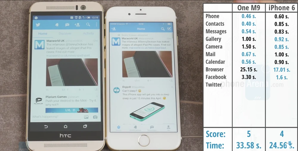 Nhưng đó được xem là những chiến thắng hiếm hoi của HTC One M9 trong cuộc chiến này. Trong hầu hết những bài test còn lại, chiếc iPhone đều thắng, và còn có phần thắng vượt trội .Những ứng dụng từ bên thứ 3 như Facebook, Twitter,.. dường như vẫn chưa được tối ưu tốt trên nền tảng Android, hay ít nhất là trên chiếc HTC One M9. Và một lần nữa Apple lại chứng minh cho mọi người thấy, cấu hình trên một chiếc smartphone không phải là tất cả.