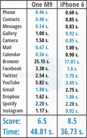 - HTC One M9 (Android 5.0.2): 6.5 điểm, tổng thời gian thực hiện bài test 48.81s.