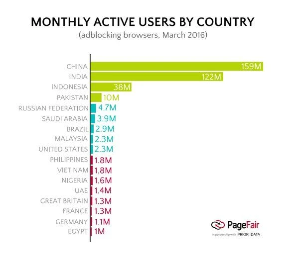 Người dùng ở châu Âu và Bắc Mỹ rất ít sử dụng phần mềm chặn quảng cáo trên di động, chỉ có 4,3 triệu người Mỹ (tương đương 2% dân số sở hữu smartphone) so với 159 triệu người ở Trung Quốc.