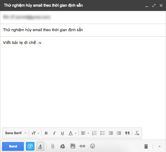 - Bước 4: Sau khi soạn thảo nội dung xong, bạn hãy chọn vào biểu tượng Mail2Cloud, lựa chọn tính năng Self Destruct rồi nhấn Send để gửi thư. Theo đó, email sẽ tự động được hủy sau năm phút và bạn sẽ nhận được thông báo khi người nhận đọc thư.
