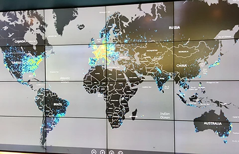 Bản đồ tương tác giám sát 24/7 tình hình tội phạm mạng trên khắp thế giới đặt tại trung tâm tội phạm mạng Microsoft ở Redmond (Hoa Kỳ). Ảnh: PHP