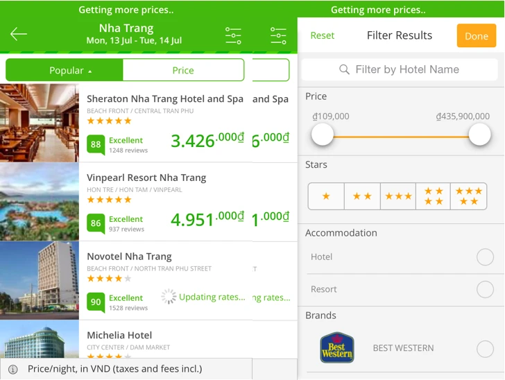 Bạn nhập địa điểm vào khung Search Location, chọn ngày nhận phòng (Check-in date) và trả phòng (Check-out date), số người ở (Guests), số phòng (Rooms) rồi nhấn nút Search hotels để tiến hành tìm kiếm. Bạn nhấn vào nút 3 gạch ở góc phải, chọn khoảng giá phòng phù hợp (price), số sao của khách sạn (stars), accomodation là hotel (khách sạn) hay resort (khu nghỉ dưỡng), tên khách sạn (Brands) rồi nhấn Done để tìm kiếm. WeGo tự động sắp xếp các khách sạn theo 2 tiêu chí là độ phổ biến (Popular) và giá cả (Price), và bạn có thể nhấn vào hai nút này để sắp xếp từ lớn đến nhỏ và ngược lại.