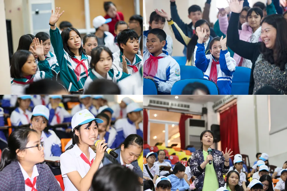 Các em học sinh và giáo viên sôi nổi tham gia hoạt động định hướng nghề nghiệp và chia sẻ từ các em học sinh về ước mơ, nghề nghiệp mong muốn theo đuổi