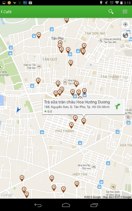Khi đã chọn vào thể loại cần tìm, ngay lập tức Nha Nha sẽ hiển thị các vị trí tương ứng xung quanh bạn. Nếu không tìm thấy, bạn cần kích vào biểu tượng GPS để nó xác định lại vị trí của bạn.