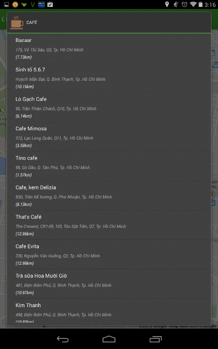 Thông tin của từng địa điểm được hiển thị rất rõ ràng bao gồm hình ảnh, đường đi, địa chỉ và số điện thoại liên lạc (nếu có). Ngoài ra, nếu bạn muốn xem lại toàn bộ danh sách mà ứng dụng tìm được thì có thể nhấp vào biểu tượng để xem tổng quát hơn.