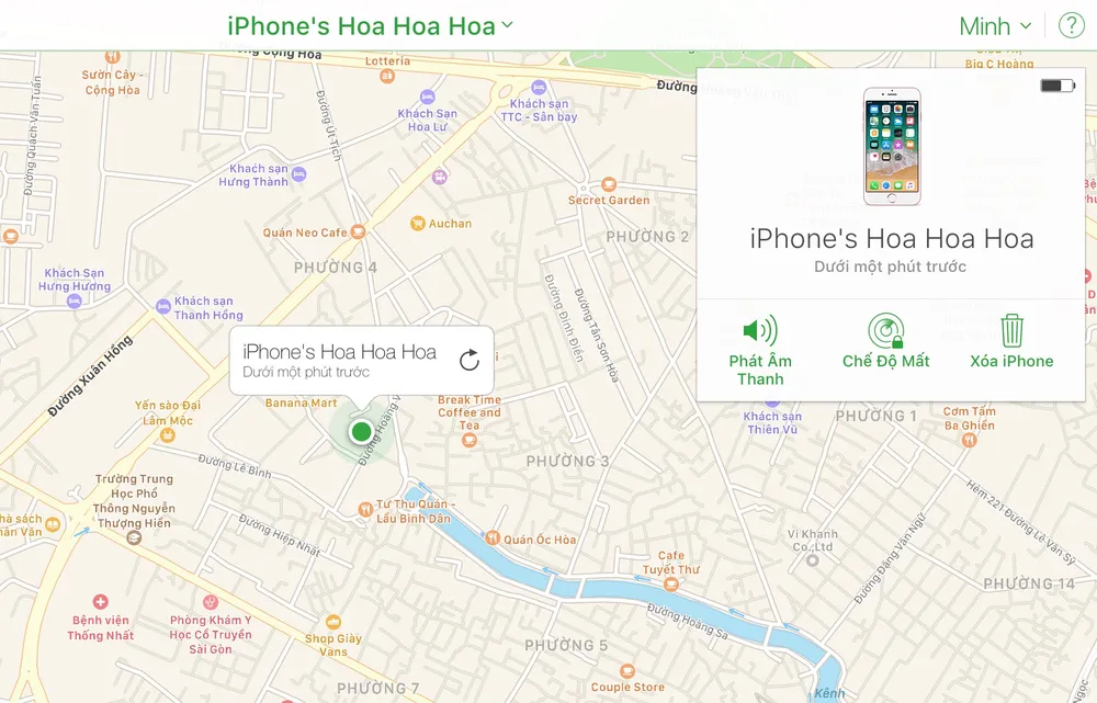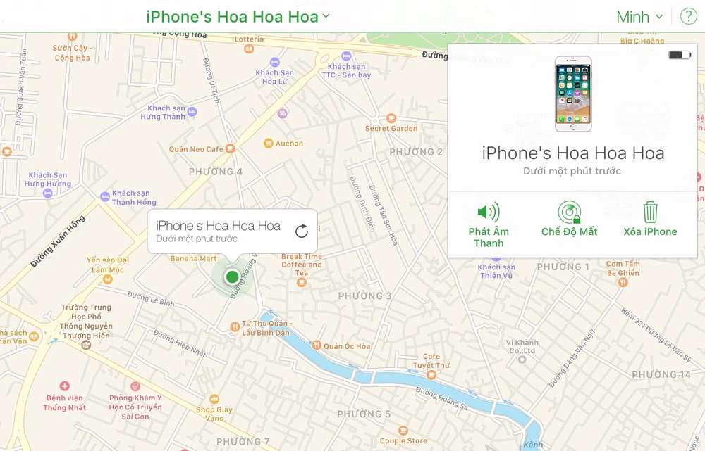 Lúc này trên bản đồ sẽ hiển thị vị trí của iPhone/iPad. Tại đây, người dùng cũng có thể kích hoạt Lost mode (chế độ mất) hoặc xóa dữ liệu từ xa nếu cảm thấy cơ hội tìm lại thiết bị chỉ bằng con số 0.
