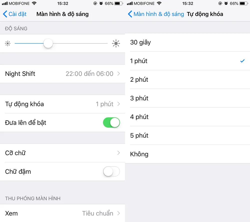 Bên cạnh đó, bạn cũng nên kích hoạt tính năng Auto lock (tự động khóa) màn hình trong phần Settings (cài đặt) > Display & Brightness (màn hình & độ sáng). Trong cửa sổ tiếp theo, bạn hãy lựa chọn khoảng thời gian tự động khóa thiết bị, đơn cử như 30 giây, 1 phút, 5 phút…