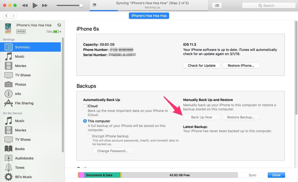 Đầu tiên, bạn hãy kết nối iPhone/iPad vào máy tính thông qua cáp kết nối, sau đó mở iTunes và chờ một lát để thiết bị được nhận diện. Tiếp theo, người dùng chỉ cần bấm vào biểu tượng iPhone ở góc trên bên trái và chọn Back Up Now.