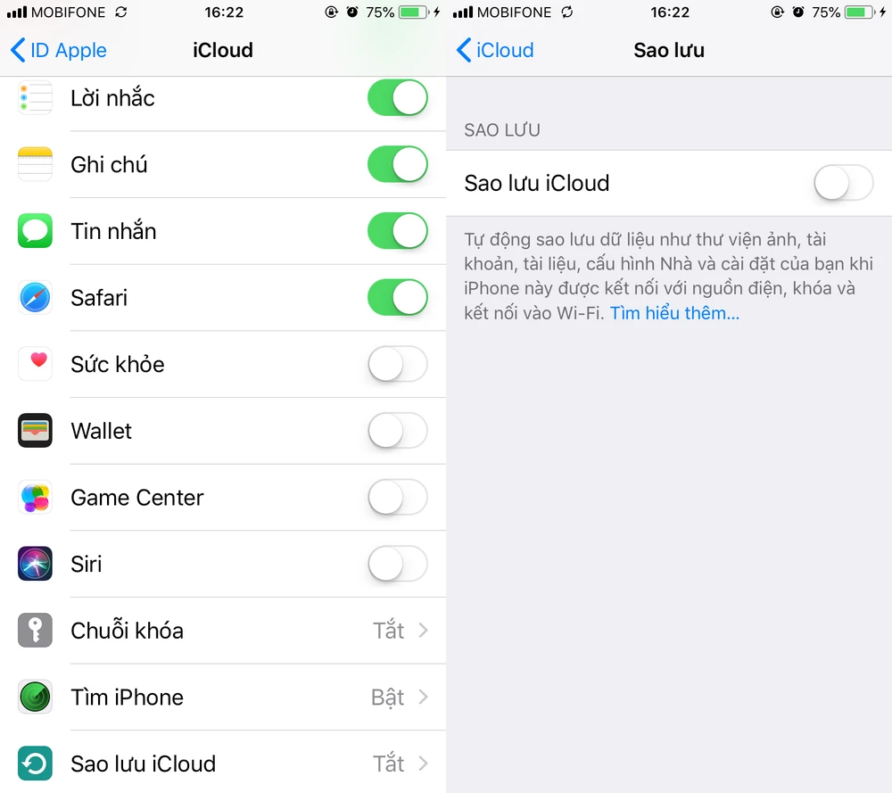Nếu muốn sao lưu dữ liệu lên iCloud, bạn hãy vào phần Settings (cài đặt) trên iPhone, bấm vào tên tài khoản, chọn iCloud và đăng nhập khi được nhắc nhở. Tiếp theo, người dùng chỉ cần chọn những thứ cần sao lưu và mọi việc sẽ được thực hiện tự động. Hãy chắc chắn rằng tùy chọn iCloud Backup (sao lưu iCloud) đã được kích hoạt sẵn.