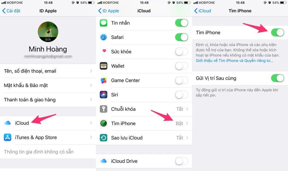 Đầu tiên, bạn hãy truy cập vào Settings (cài đặt) > iCloud và đăng nhập bằng tài khoản Apple ID, làm theo các bước hướng dẫn cho đến khi hoàn tất. Nếu đã đăng nhập trước đó, người dùng chỉ cần kéo xuống bên dưới và kích hoạt tùy chọn Find my iPhone (tìm iPhone) > Find my iPhone (tìm iPhone) và gửi vị trí máy sau cùng.