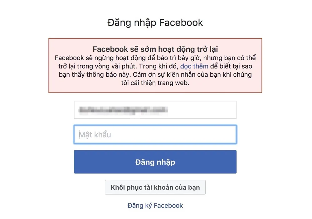 Tương tự, khi đăng nhập Facebook, người dùng cũng sẽ thấy xuất hiện thông báo Facebook ngừng hoạt động để bảo trì và sẽ sớm trở lại trong vài phút.