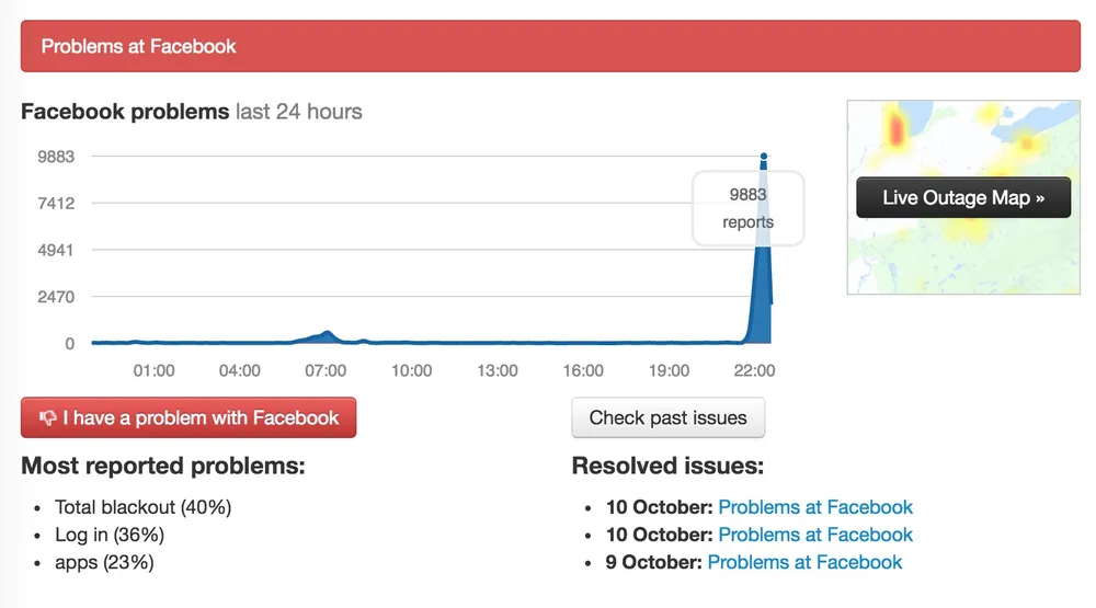 Kynguyenso.plo.vn đã kiểm tra tình trạng hoạt động của Facebook thông qua trang web DownDetector tại http://downdetector.com/status/facebook. Kết quả cho thấy có khoảng gần 10.000 lượt báo cáo sự cố trên toàn thế giới, và con số này vẫn đang không ngừng tăng lên. Trong đó có khoảng 36% không thể đăng nhập và 23% gặp sự cố với ứng dụng Facebook.