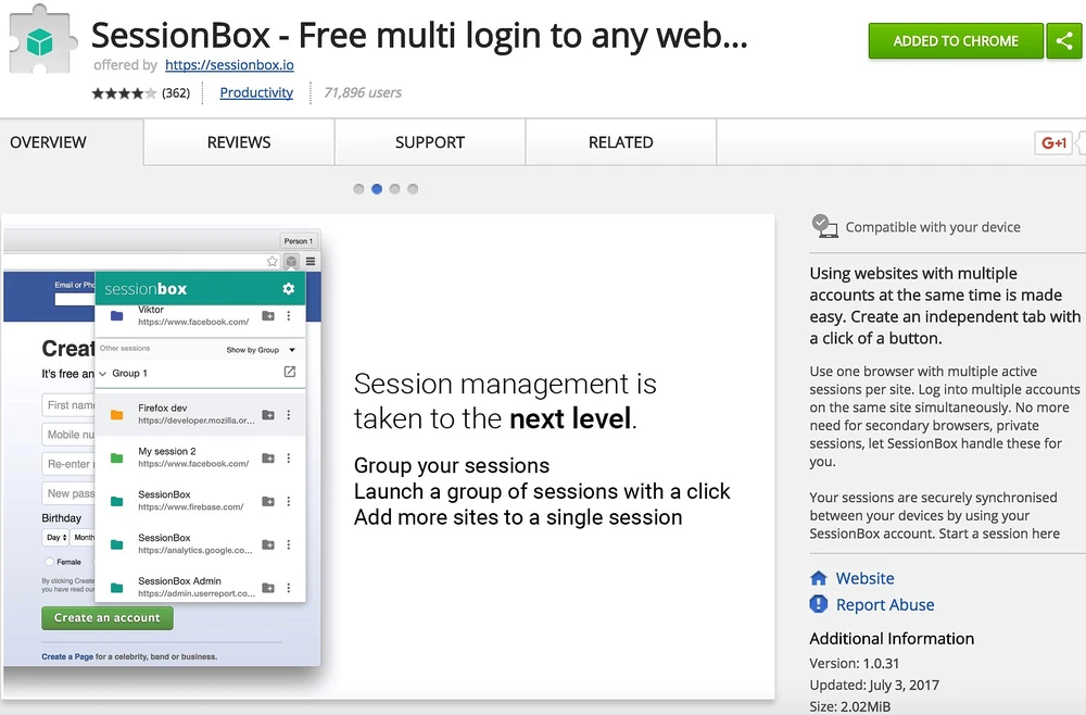 Khi hoàn tất, bạn cần tạo cho mình một tài khoản miễn phí nếu muốn đồng bộ dữ liệu trên mọi thiết bị. Để thêm tài khoản Facebook mới, người dùng chỉ cần truy cập vào địa chỉ https://www.facebook.com/, bấm vào biểu tượng SessionBox ở góc trên bên phải và chọn dấu cộng, đặt tên, chọn màu sắc… Thực hiện tương tự cho các tài khoản khác.
