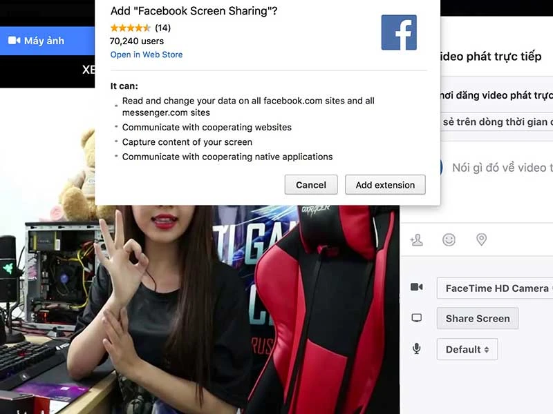 Để sử dụng, bạn chỉ cần truy cập vào Facebook, nhấp vào tùy chọnLive video (video trực tiếp) > Share Screen > Add extension. Sau đó lựa chọn cửa sổ màn hình cần chia sẻ rồi bấm Share > Go Live (phát trực tiếp).