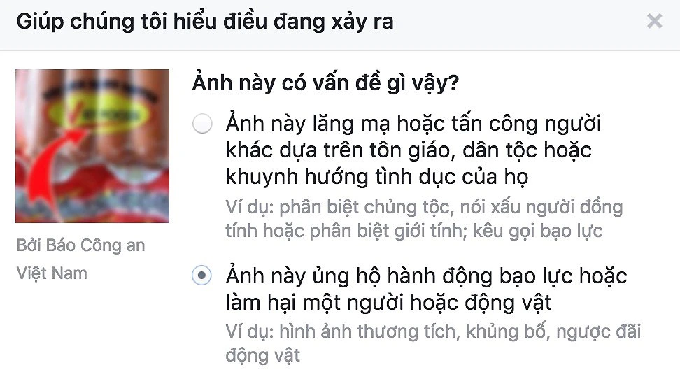 Tiếp theo, bạn chọn Something else (lý do khác) > This advocates violence or harm to a person or animal (ảnh này ủng hộ hành động bạo lực, làm hại một người hoặc động vật) > Submit to Facebook for Review (báo cáo bài viết với Facebook).