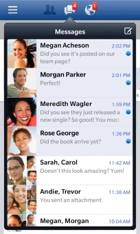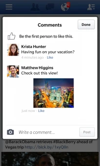 Với ứng dụng Facebook trên BlackBerry 10, người dùng có thể xem nhiều post chứa nhiều ảnh trong một khung như những ứng dụng ghép ảnh. Bên cạnh đó, các ảnh được đánh dấu trong comment cũng được truy cập dễ dàng hơn như trên Android. Phiên bản cập nhật cũng cho phép người dùng truy cập Feed (dòng trạng thái bạn bè) được nhanh chóng và thuận tiện nhất.