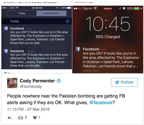 Người sử dụng Facebook ở khắp nơi trên thế giới từ Honolulu đến Brussels hay Cairo đến Hong Kong sau đó đều nhận thông báo trên. Nhiều người dùng Facebook tại Việt Nam cũng nhận được thông báo với nội dung: “Bạn có sao không? Dường như bạn đang ở trong khu vực chịu ảnh hưởng của vụ nổ ở Lahore, Pakistan. Hãy cho bạn bè biết là bạn vẫn an toàn”.