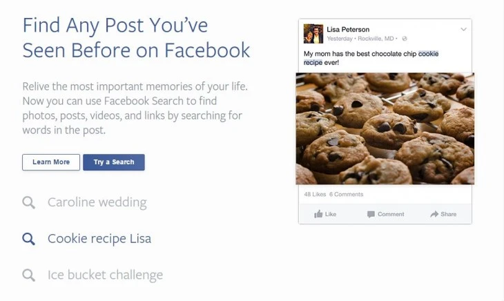 Để tìm một bài viết, bạn chỉ cần gõ một số từ khóa, ví dụ như: "Caroline wedding" hay “Ice bucket challenge”. Điều này cơ bản giống như bạn một câu hỏi trên Google, ngoại trừ trong trường hợp bạn đang tìm kiếm thông qua một cơ sở dữ liệu của bài viết được thực hiện bởi bạn hoặc bạn bè của bạn.