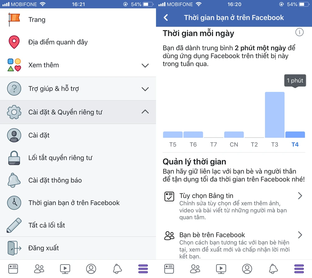 Đầu tiên, bạn hãy cập nhật ứng dụng Facebook lên phiên bản mới nhất thông qua App Store hoặc Google Play. Khi hoàn tất, người dùng chỉ cần mở ứng dụng, bấm vào biểu tượng menu ở góc phải và chọn Settings & Privacy (cài đặt & quyền riêng tư) > Your Time on Facebook (thời gian bạn ở trên Facebook).