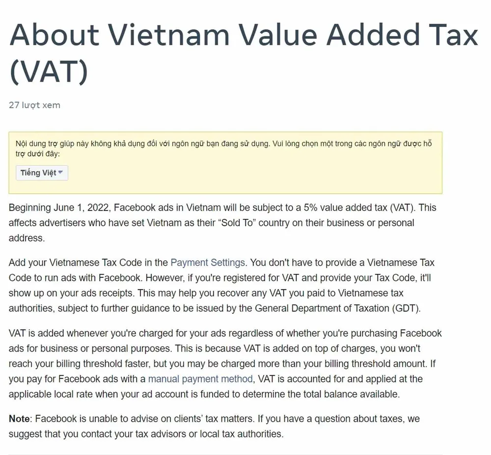 Mức thuế 5% sẽ được tính trước khi quảng cáo được thực hiện, do đó, người dùng sẽ phải trả thêm một khoản tiền khi chạy quảng cáo trên Facebook. Đối với hình thức thanh toán thủ công, khoản thuế này sẽ được tính dựa trên tỉ giá thực tế.