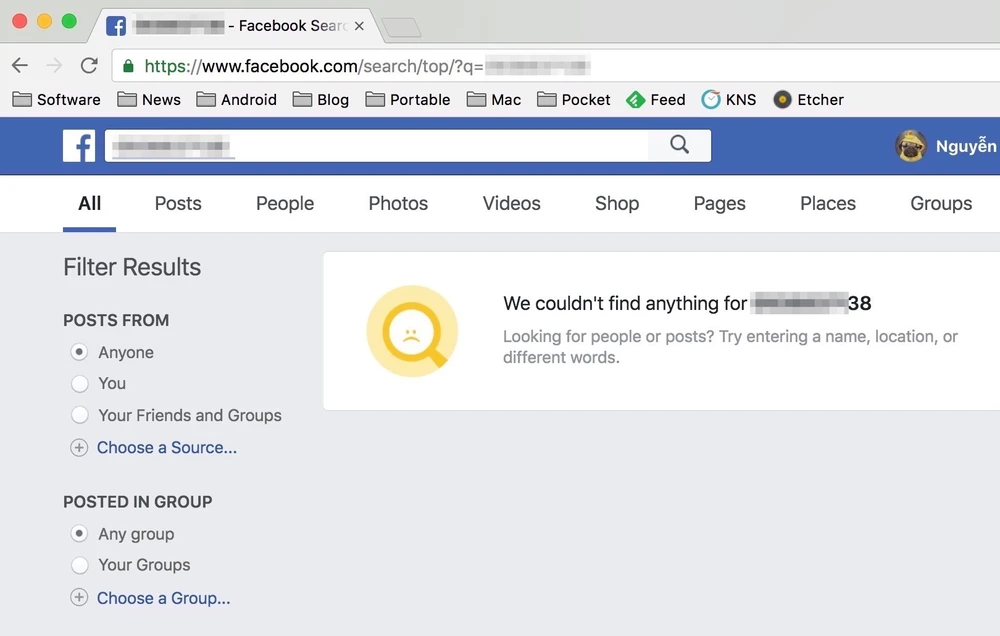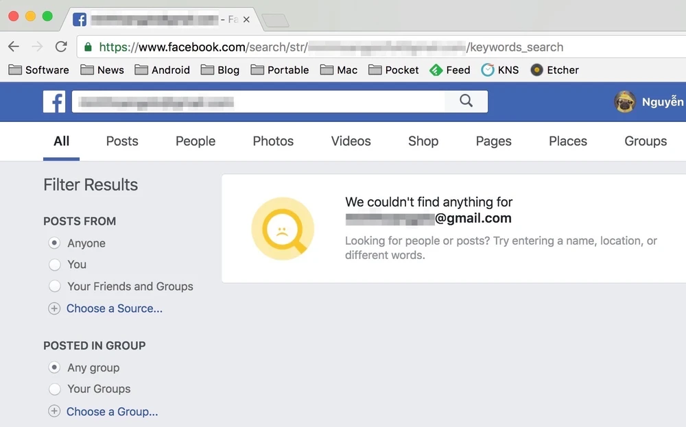Khi người viết thử tìm kiếm thông tin về bạn bè thông qua số điện thoại và email đã đăng ký trước đó, Facebook chỉ hiển thị thông báo không tìm thấy bất cứ thứ gì liên quan đến từ khóa trên.
