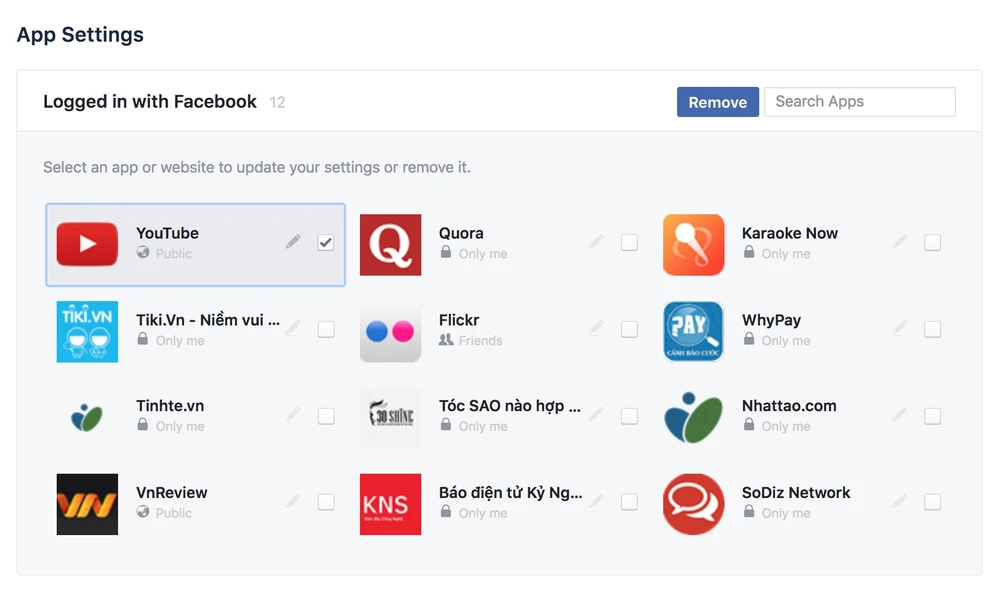 Xóa bớt các ứng dụng mà bạn đã đăng nhập bằng tài khoản Facebook trước đó. Ảnh: MINH HOÀNG