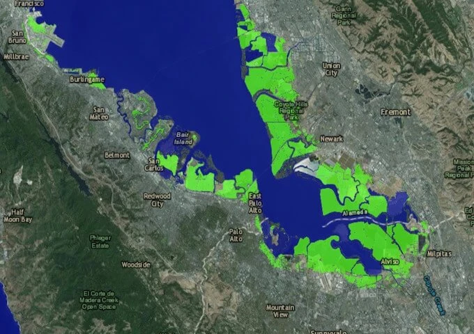 Các nhà khoa học thuộc nhóm Our Coast, Our Future đã lập bản đồ những đối tượng, vùng đất bị ảnh hưởng khi nước biển dâng cao. Theo đó, các khu vực được đánh dấu màu xanh lá cây trong vịnh San Francisco sẽ bị chìm trong biển nước, đó là kết quả của việc nóng lên trên toàn cầu.