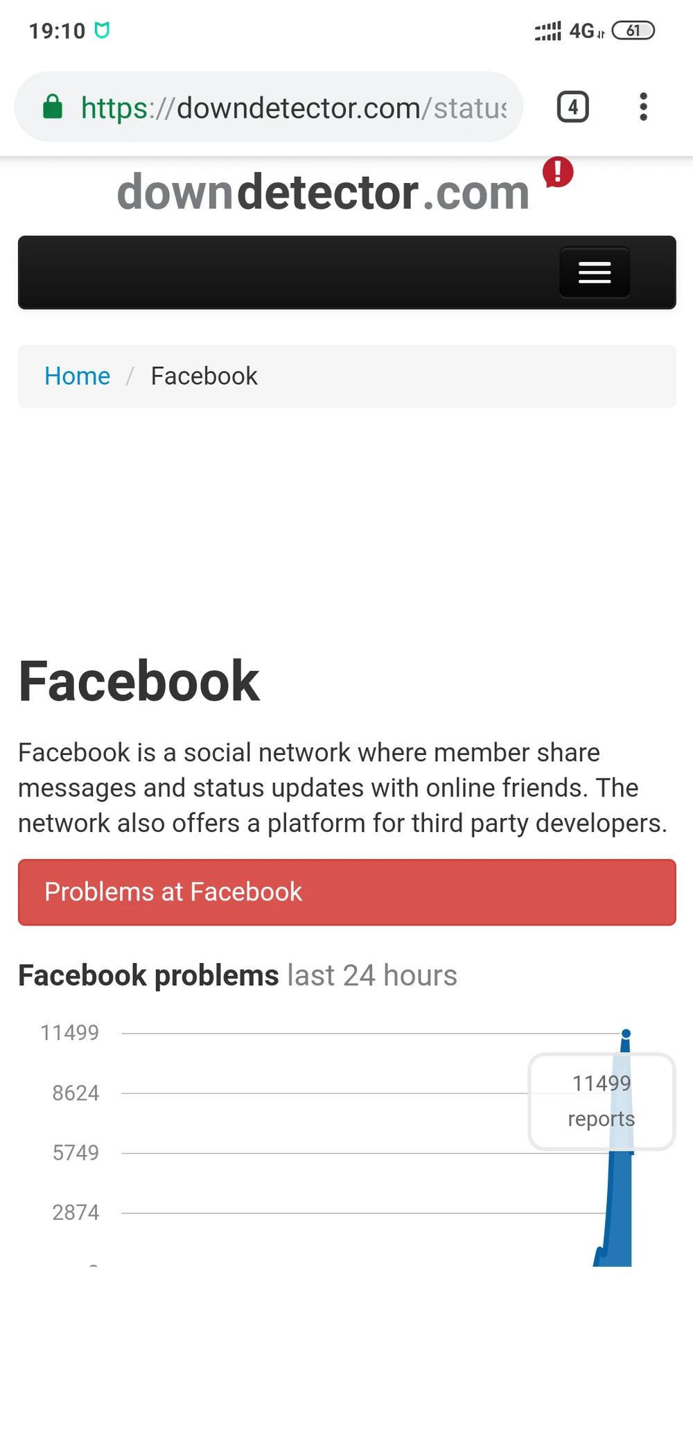 Khi thử kiểm tra tình trạng hoạt động của Facebook bằng trang DownDetector, có đến hơn 11.000 lượt báo cáo sự cố. Trong đó có 57% người dùng không thấy nội dung mới trên bảng tin, 21% không thể đăng nhập hoặc gặp khó khăn khi truy cập.