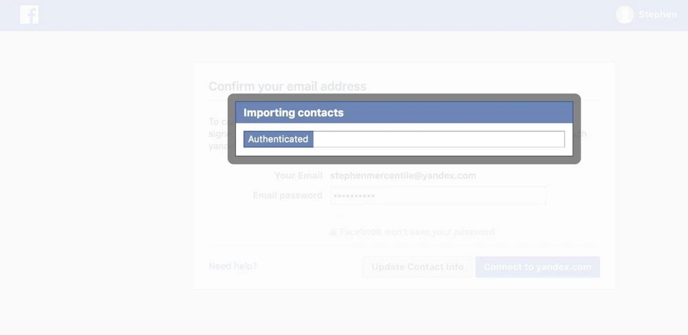 Business Insider cũng phát hiện ra rằng nếu người dùng chọn nhập mật khẩu tài khoản email trên Facebook, một cửa sổ nhỏ sẽ bật lên và hiển thị thông báo cho biết Facebook đang nhập danh bạ, mặc dù người dùng không hề cho phép.